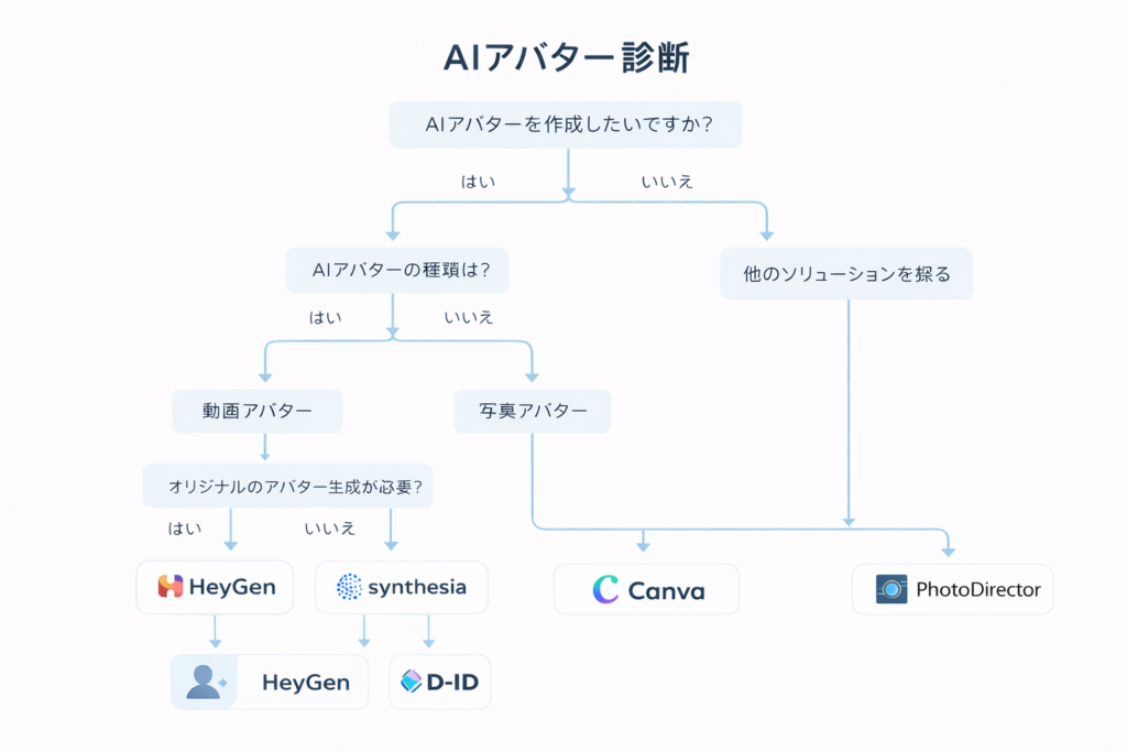 AIアバターツールを選ぶ際は、「静止画・動画・対話のどのタイプが必要か」「商用利用の有無」「予算」の3点を明確にすることが成功の鍵です。