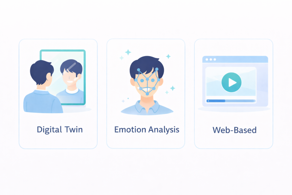 「誰が面接するか」によって評価がブレる、あるいは「練習相手がいない」という課題を、独自のデジタルツイン技術で解決します。